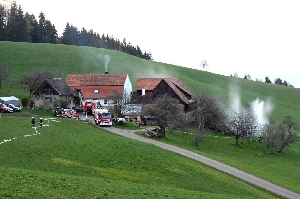 Annahme war Rauchentwicklung im Stadel mit der Gefahr eines Brandausbruches und drei vermissten Personen. Es wurde rasch eine Wasserversorgung aus dem rund 300 Meter entfernten neuen Löschteich aufgebaut, vorher kam das Lösch- bzw. Kühlwasser aus dem TLF.