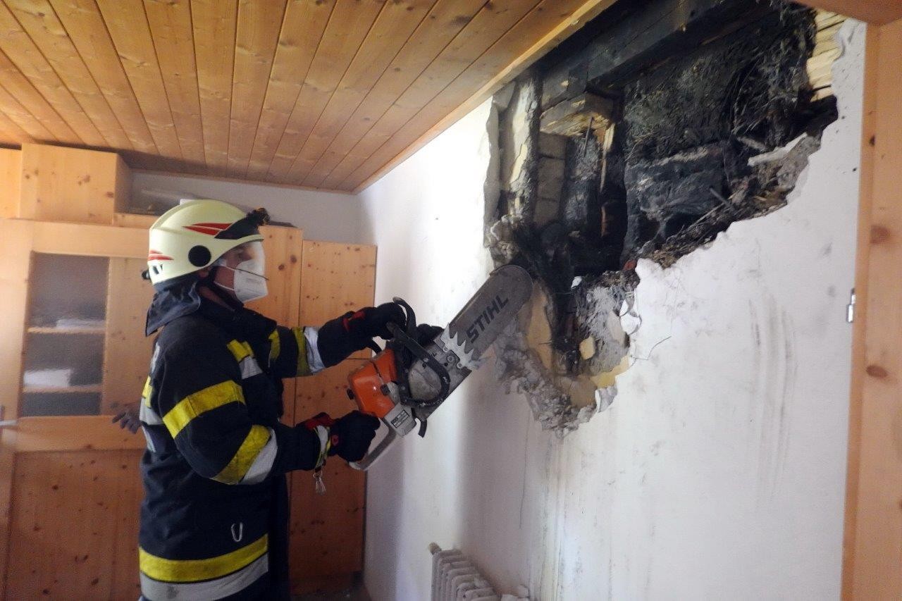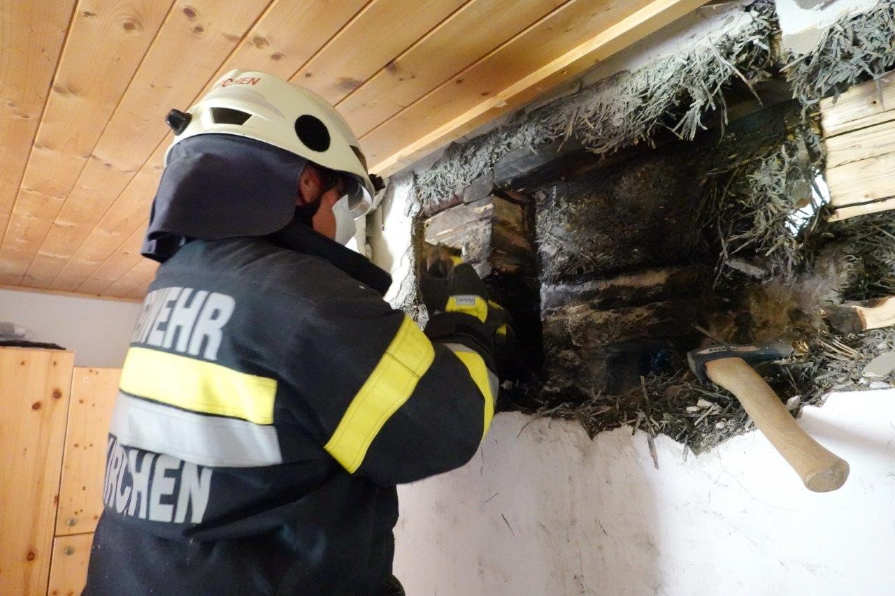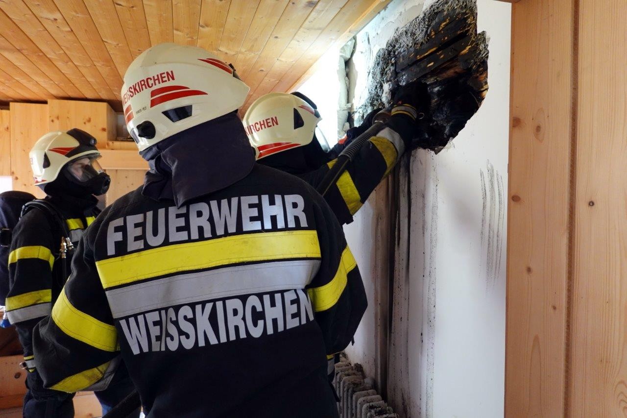Gleich nach dem Eintreffen der FF Weißkirchen unter Einsatzleiter Markus Kogler wurde festgestellt, dass der Rauch weniger aus dem vermuteten Zwischendeckenbrand hervorquoll, sondern vielmehr aus einer Wand.