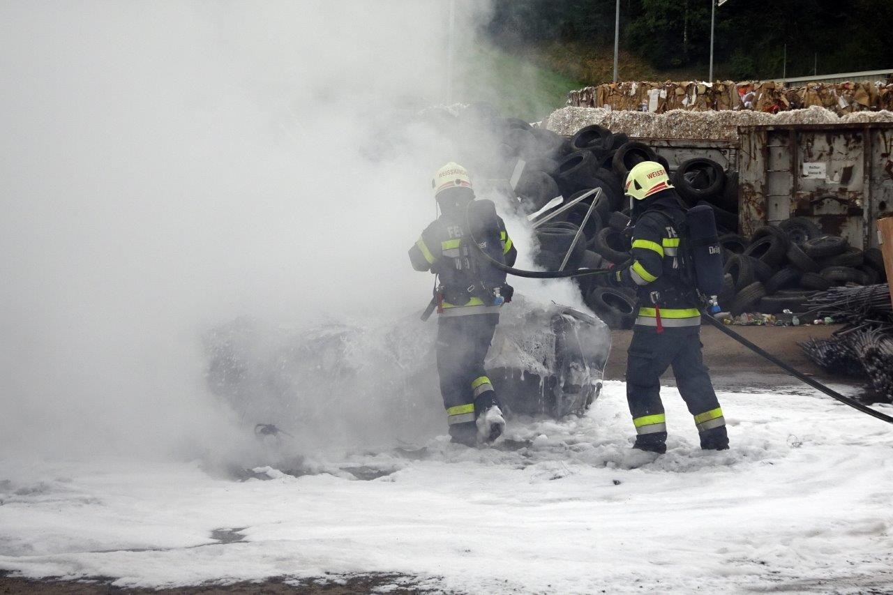 Ein PKW-Wrack, bei dem gerade Rohstoff-Trennungsarbeiten vorgenommen worden sind, geriet in Brand. Die Arbeiter versuchten erfolglos das Löschen und riefen daraufhin die Feuerwehr zu Hilfe. Beide Wehren sind mit insgesamt 22 Mann und vier Fahrzeugen rasch am Einsatzort eingetroffen und konnten in kürzester Zeit mittels Schaum den Brand löschen.