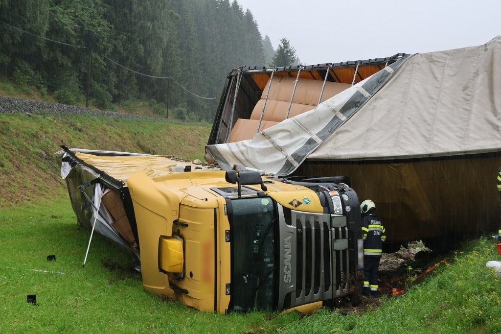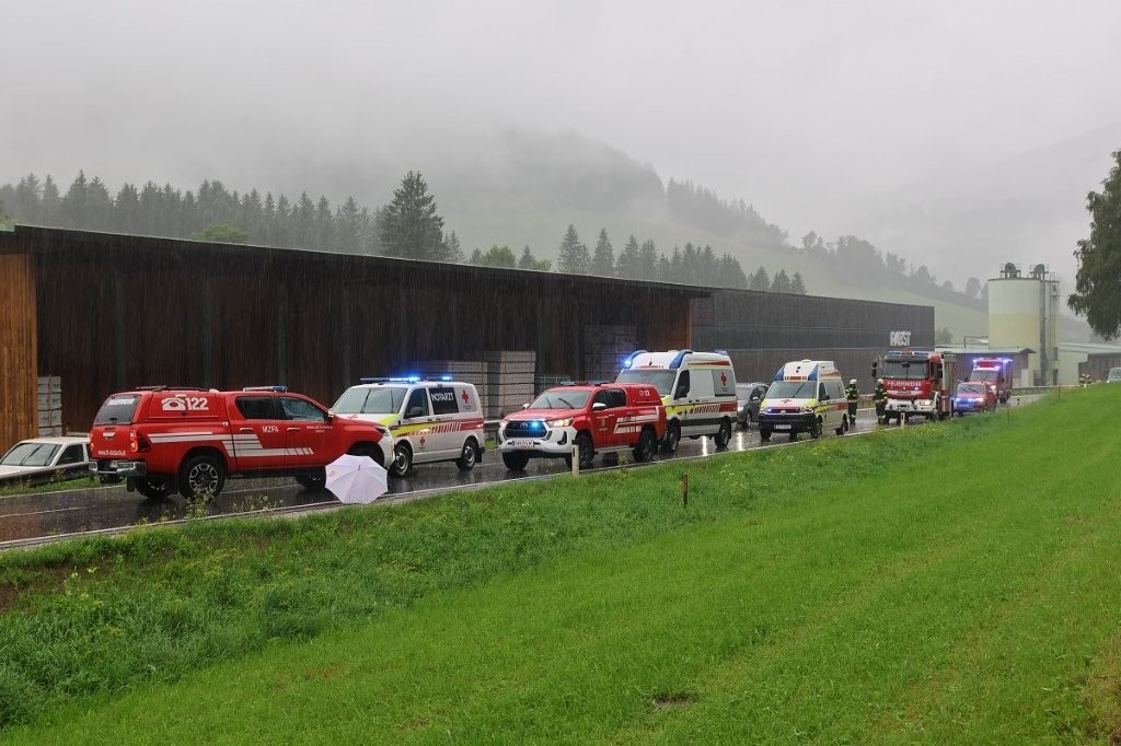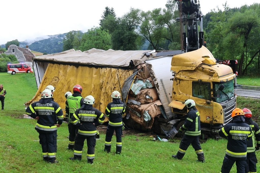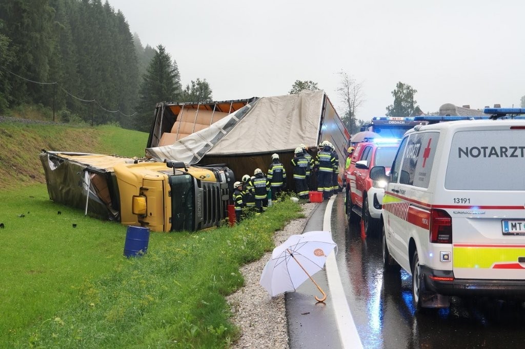 Aus bislang unbekannter Ursache kamen ein LKW sowie ein PKW von der Fahrbahn ab. Am Einsatzort bot sich ein dramatisches Bild: Ein LKW lag seitlich in einer Wiese, sein Anhänger war auf dem Fahrzeug zum Liegen gekommen. Einige Meter weiter wurde ein beschädigter PKW aufgefunden.