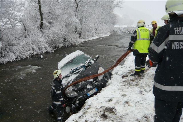 Die alarmierte Feuerwehr Weißkirchen rückte mit 2 Fahrzeugen und 10 Mann unter der Einsatzleitung von ABI Reinhold Staubmann aus. Mittels Seilwinde bei gleichzeitiger Sicherung des verunfallten PKW´s, damit dieser nicht kopfüber in den Granitzenbach umstürzt, wurde der PKW herausgezogen und dem Bergewagen eines KFZ-Unternehmers übergeben.