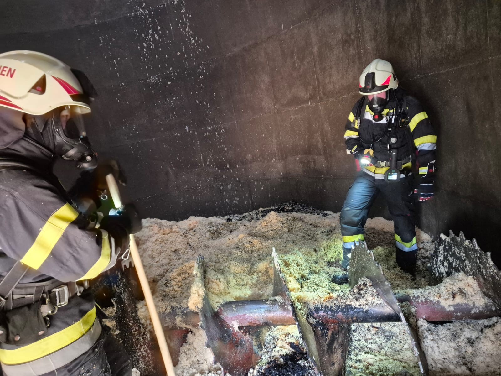 Unter schwerem Atemschutz begannen mehrere Trupps mit den aufwendigen Ausräumarbeiten. Dabei zeigte sich, dass sich im Inneren des Silos ein Brandherd entwickelt hatte, dessen Ursache derzeit unbekannt ist.